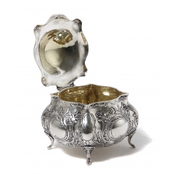 Высота: 8,5 см, размеры верха: 7,5 х 7,5 см. Вес: 259 граммов серебра 830 пробы. ========================== Silver sugar bowl or casket, decorated with floral ornaments.