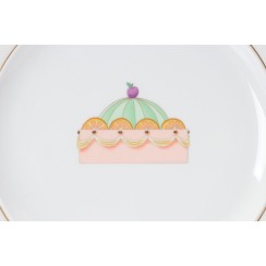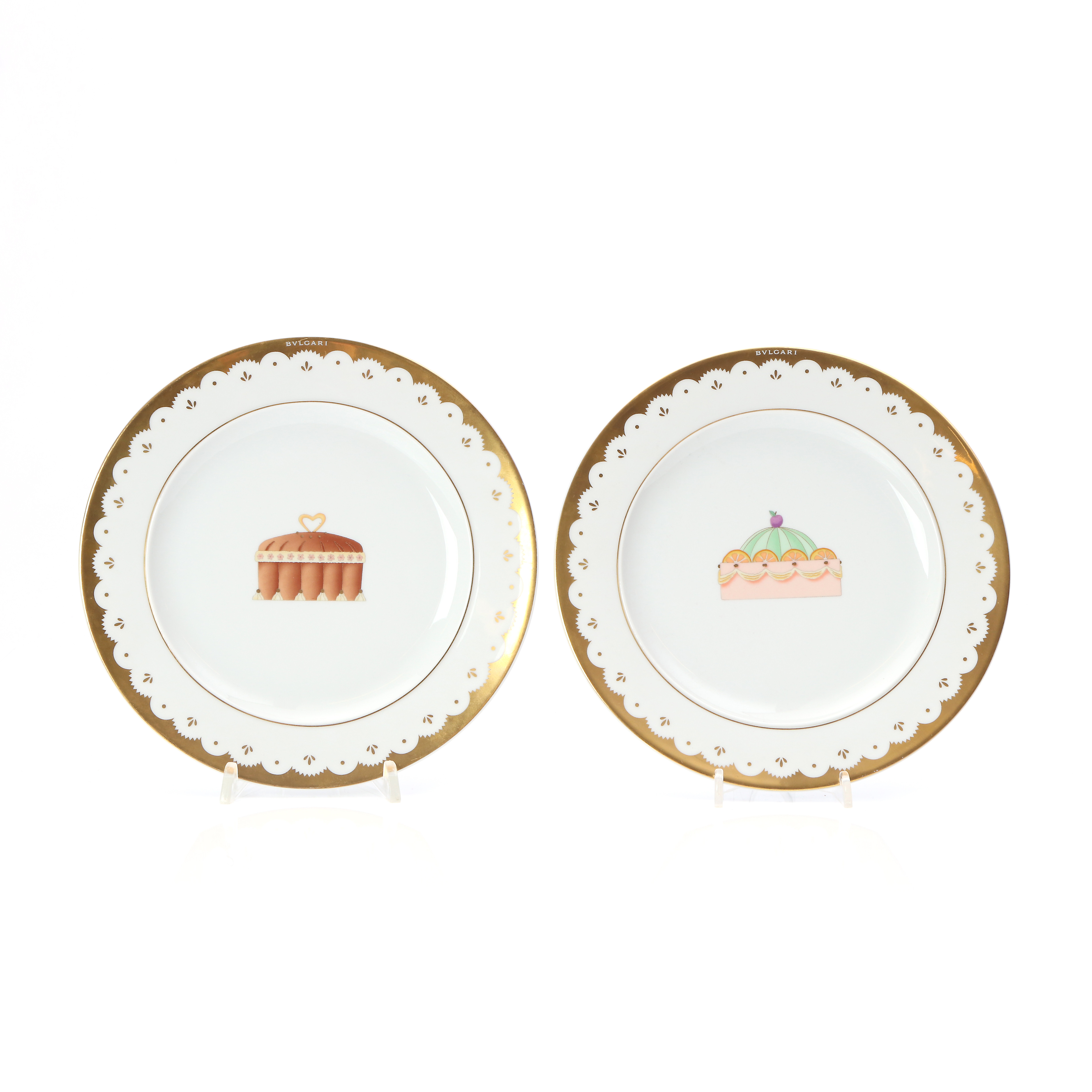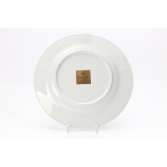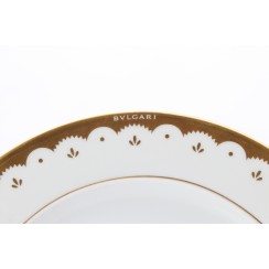 Две фарфоровые тарелки для десерта, диаметр 22,4 см, высота 2 см, BVLGARI / ROSENTHAL одна тарелка практически новая, ею не пользовались, без царапин на золоченом ободке второй тарелки несколько мелких царапинок - результат совсем незначительного использования