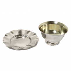 Общий вес: 586 граммов серебра 830 пробы. ============================ Silver sugar bowl on a stand (footed bowl or jam bowl). Sweden, Stockholm, year 1848, workshop Jacob Engelberth Torsk (worksed since 1836 to 1860). Bowl: height: 9.5 cm, top diameter: 15.7 cm, weight: 329 grams. Stand: brim height: 3 cm, maximum diameter: 19.8 cm, bottom diameter: 11 cm, weight: 257 grams.