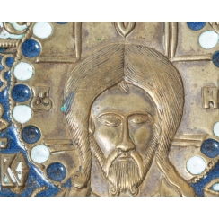 Литой трехстворчатый складень Деисусный чин (икона) Господь Вседержитель, Божья Матерь и Иоанн Креститель. Бронза, литье, эмаль.