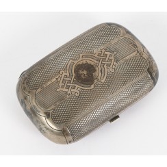 264345 - Серебряный кошелек с муаровым подкладом, Российская империя (Россия), общий вес 58 гр, серебро 84 пр, длина 7,5 см, ширина 5 см, толщина 2,7 см |