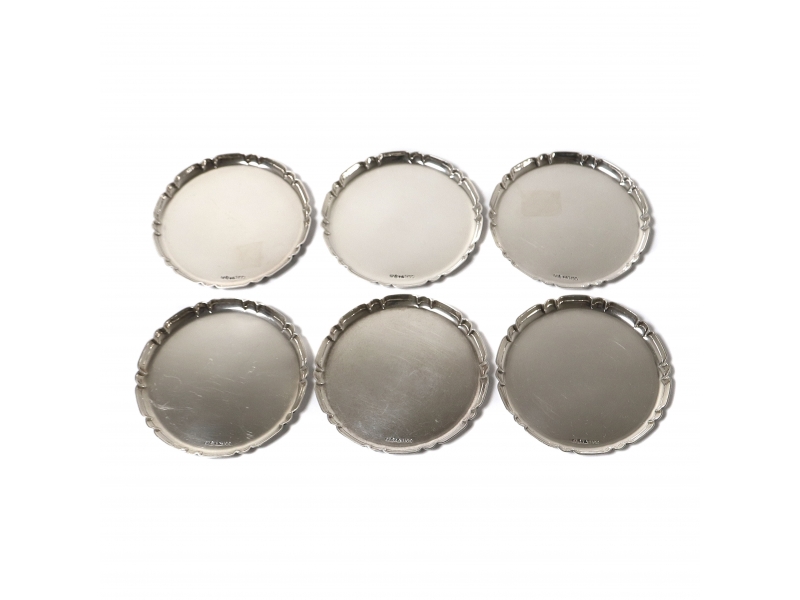 Диаметр: 8 см. Общий вес: 261 грамм серебра 830 пробы. ========================== Barware serving silver coasters, 6 pcs.