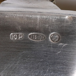 Трехзначное пробирное советское клеймо в овале 1927 - 1946 гг: "голова рабочего" с литерой "τ" (тау) и цифрой "875", где: "голова рабочего" - знак удостоверения; "τ" (тау) - шифр Костромского пробирного управления; цифра "875" удостоверяет, что изделие выполнено из серебра 875 пробы.