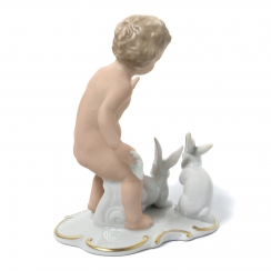 Фарфоровая фигура (статуэтка) "Обнаженный мальчик (путти) с кроликами". Ручная роспись.