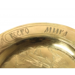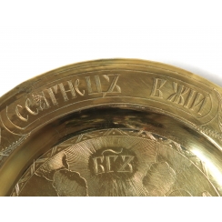 Клейма на дискосе: "АЛ" - клеймо с инициалами мастера. Годовик с цифрой "1810", указывающей год клеймения, и буквами "IB" - инициалами пробирного мастера Вихляева Ивана (годы работы: 1802-1818). Цифра "84" удостоверяет, что изделие выполнено из серебра 84 золотниковой пробы. "Георгий Победоносец" - клеймо города Москвы ------------- Клейма на звездице: "ДА" - клеймо с инициалами мастера. Годовик с цифрой "1832", указывающей год клеймения и буквами "АК" - инициалы пробирного мастера Ковальского Андрея Антоновича (годы работы: 1821-1856). Цифра "84" удостоверяет, что изделие выполнено из серебра 84 золотниковой пробы. "Георгий Победоносец" - клеймо города Москвы. ============================ Silver diskos with a star, gilding.