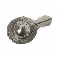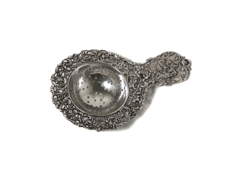 Серебряное ситечко для чая, декорированное растительным узором и сюжетной миниатюрой.
