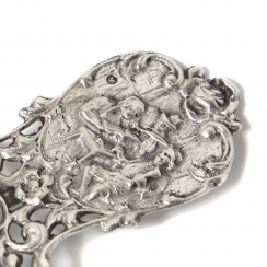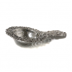 Длина: 10,5 см, внешний диаметр ситечка: 6,4 см. Вес: 28 граммов серебра 833 пробы. ======================= Silver strainer for tea, decorated with plant patterns and narrative miniatures.
