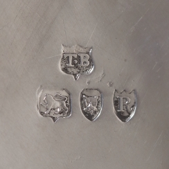 Height of salt cellars: 3.2 cm, diameter of top: 4.5 cm. Spoon lengths: 7 cm, 6.2, and 5.9 cm.