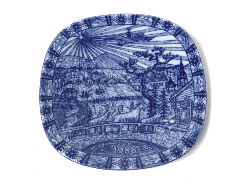 Коллекционная фарфоровая тарелка 1988 года из серии "Рождество" с мотивом из знаменитой книги Сельмы Лагерлёф «Чудесное путешествие Нильса Хольгерссона с дикими гусями по Швеции». На тарелке 1988 года сюжет посвящен провинции Хельсингланди изображает приключения Нильса в этой местности.