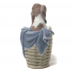 Фарфоровая фигура (статуэтка) "Щенок бассет-хаунда в корзине". Ручная подглазурная роспись.