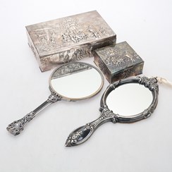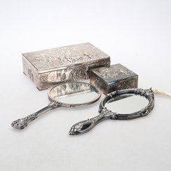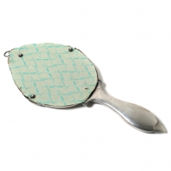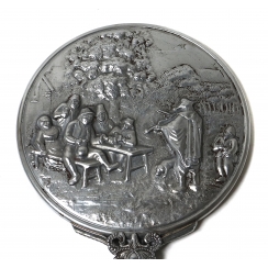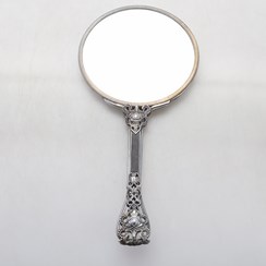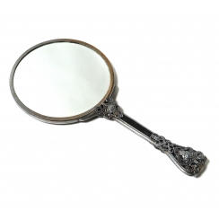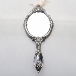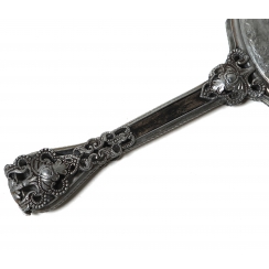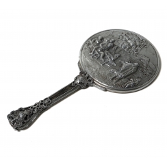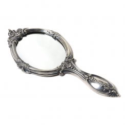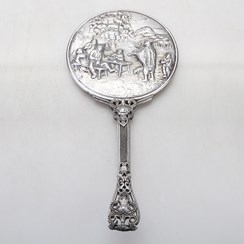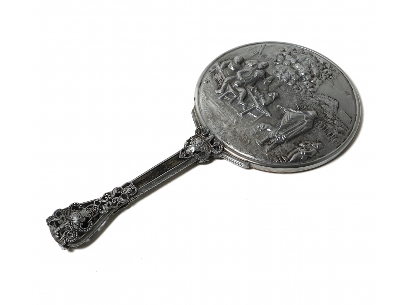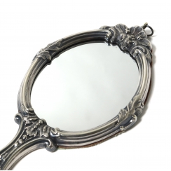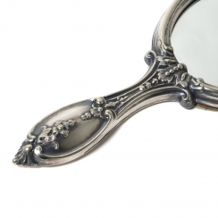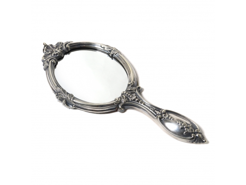 243058 - Зеркало в посеребренной оправе с ручкой. ЕвропаЗеркало в посеребренной оправе с ручкой, декорированное растительным орнаментом.