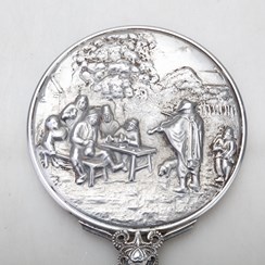 194191 - Зеркало в металлической оправе с ручкой. Европа, начало 20 века.Зеркало в металлической оправе с ручкой, декорированное сюжетной миниатюрой.