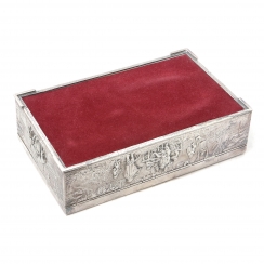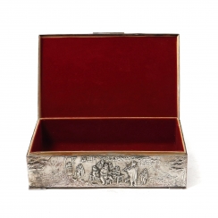 Размеры: 22 х 14 х 6,7 см. ===================== Silver-plated casket (jewelry box), decorated with plot miniature. The outer side of the bottom and the inner surface of the box are pasted over with thick velvet paper.