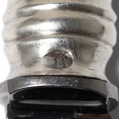 Трехзначное пробирное российско-советское клеймо в овале 1908-1926 гг. - "женская голова в кокошнике, обращенная вправо" с литерой "?" и цифрой "84", где: "женская голова в кокошнике, обращенная вправо" - знак удостоверения; "?" (?) - шифр пробирного управления; цифра "84" удостоверяет, что изделие выполнено из серебра 84 пробы. =============================== Knife with silver handle and steel blade.