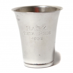Height: 6.5 cm, diameter of the top: 5.5 cm. Volume: 70 ml. Weight: 28 grams of silver 830 fineness.