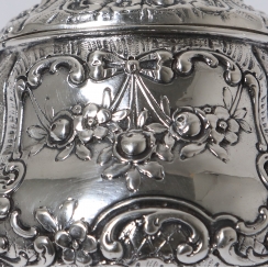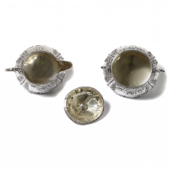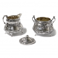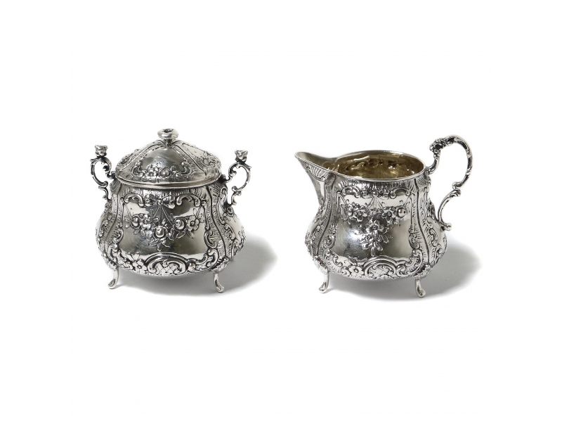Серебряные сахарница с крышкой и молочник, декорированные цветочным орнаментом.