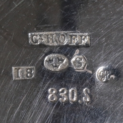 Скорее всего был произведен в Германии, первая половина 20 века. Ввезен в Швецию, г. Хельсингборг, 1935 год, импортёр Carl Hoff (годы работы: 1913-1941). Государственное пробирное клеймо Швеции для ввезенных серебряных изделий.