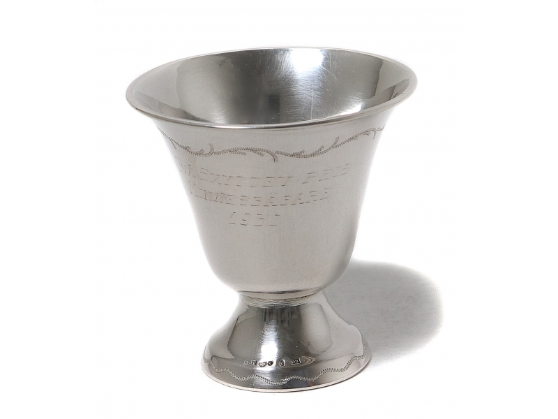 С гравировкой. Небольшие вмятины. ============================== Silver vodka cup (shot cup) in the form of a goblet.