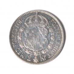 Серебряная монета номиналом 2 кроны с профилем короля Швеции Густава V (годы правления: 1907 - 1950) с надписью по кругу" Gustaf V Sveriges Konung" (С народом за Отечество).