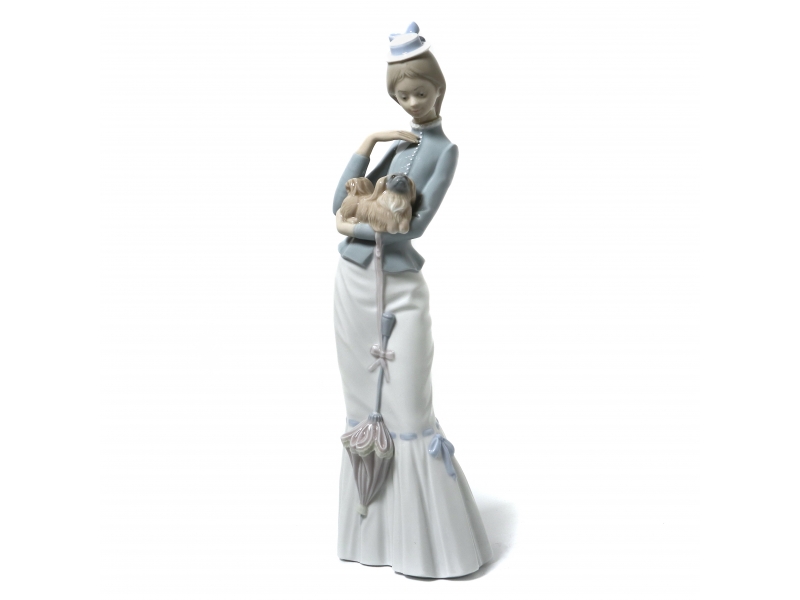 Фарфоровая фигура (статуэтка) "Прогулка с собакой" (Девушка с пекинесом). Ручная подглазурная роспись.