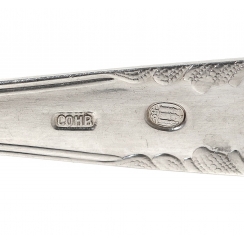 The total weight of solid silver items: 1545 grams of silver not less than 826 fineness. The total weight of knives with silver handles and steel blades: 774 grams.
