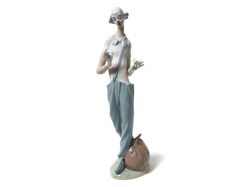 Фарфоровая фигура (статуэтка) "Влюбленный клоун" (Клоун с цветком в руке и дорожной сумкой,). Ручная подглазурная роспись.