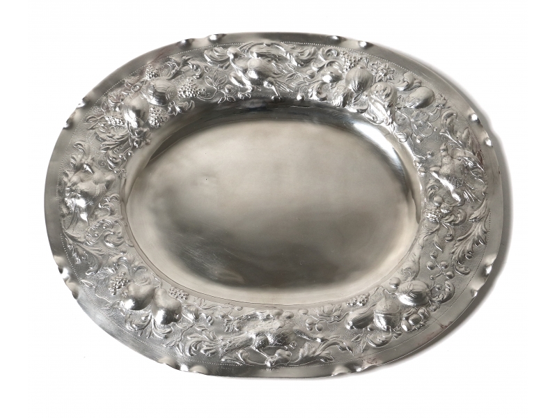 Серебряное блюдо для фруктов, винограда, декорированное рельефным растительным узором и птицами.