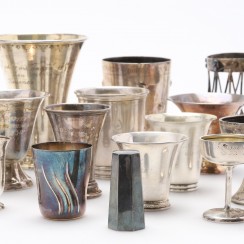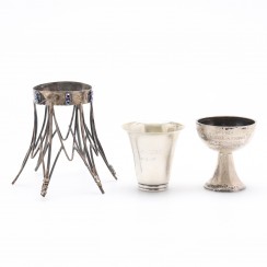Высота: 13 см, диаметр верха: 7,5 см. Объём: 130 мл. Вес с утяжелением: 78 граммов, серебро 830 пробы.