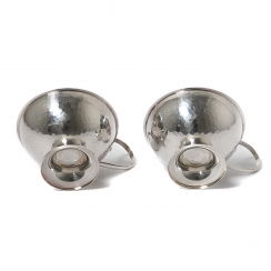 Высота: 4 см, диаметр верха: 6,4 см. Объем: 40 мл. Общий вес: 62 грамма серебра 830 пробы. ================================ Silver punch cups, 2 pcs, forging.