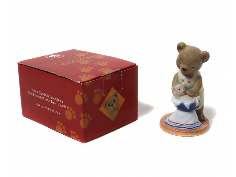 The series of figurines "Victor and Victoria’s family" was produced by Bing & Grondahl factory from 1997 to 2008 and was designed by the American artist Sheilah Beckett. She is well-known for her illustrations to more than 70 classic fairy tales. The series tells us a story of the most interesting life moments of charming teddy bears Victor and Victoria. It starts with the day of their encounter, shows family life, birth of their son Theo and it ends with the birth of their daughter Ursula. Two new figurines were produced every year since 1997 to 2004. Three new figurines were manufactured since 2005 to 2007. There were 4 new figurines produced in 2008 when the new character Ursula appeared.