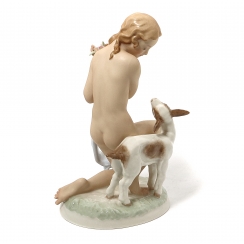 Фарфоровая фигура (статуэтка) "Обнаженная девушка с цветами и козленок". Ручная роспись.