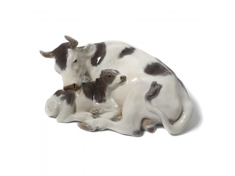 Фарфоровая фигура (статуэтка) "Корова с теленком". Ручная подглазурная роспись.