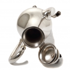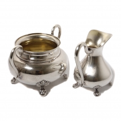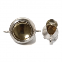Height of the coffee pot by the grip on the lid: 26.5 cm. Volume: 1150 ml. Height of the sugar bowl on the edge: 10.5 cm, diameter of the top: 10.3 cm. Height of the creamer on the spout: 11.9 cm. Volume: 300 ml.