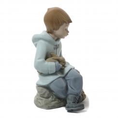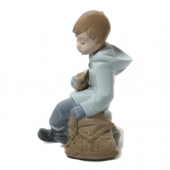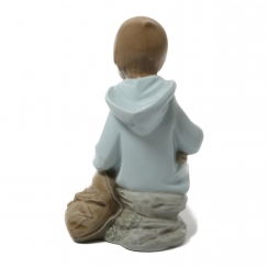 Фарфоровая статуэтка "Мальчик на отдыхе" (Мальчик с зайцем и рюкзаком). Ручная подглазурная роспись.