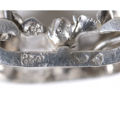Высота: 2,2 см, длина: 4,7 см, ширина: 1,3 см. Вес: 6 граммов серебра 830 пробы.