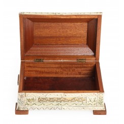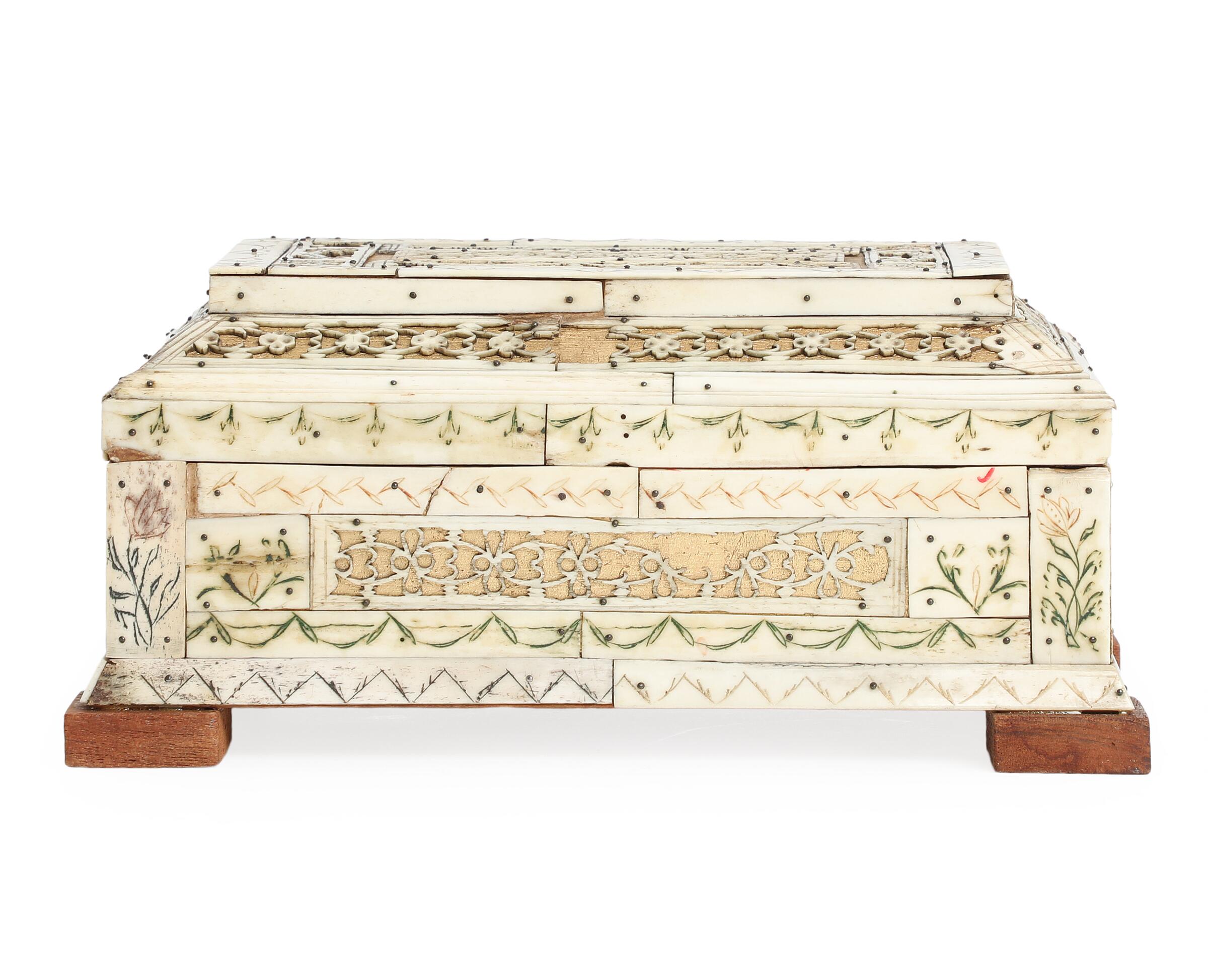 Деревянный ларец, декорированный костяными накладками с растительным орнаментом и с ажурной резьбой, конец 19 века. Максимальные размеры 24,8 х 16,7 х 11,5 см. Сзади на нижней костяной планке скол. В нескольких местах утраты мелких фрагментов ажурного узора.