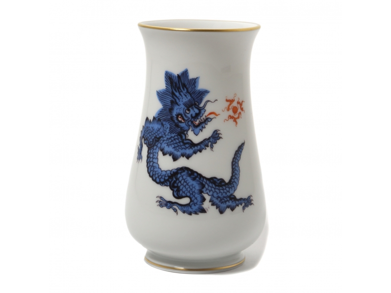 Фарфоровая ваза, декорирована рисунком синего дракона, извергающего красно-оранжевое пламя. Дизайн "Дракон Минг, голубой" (Ming dragon, blue). Ручная роспись.