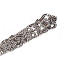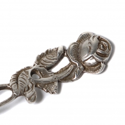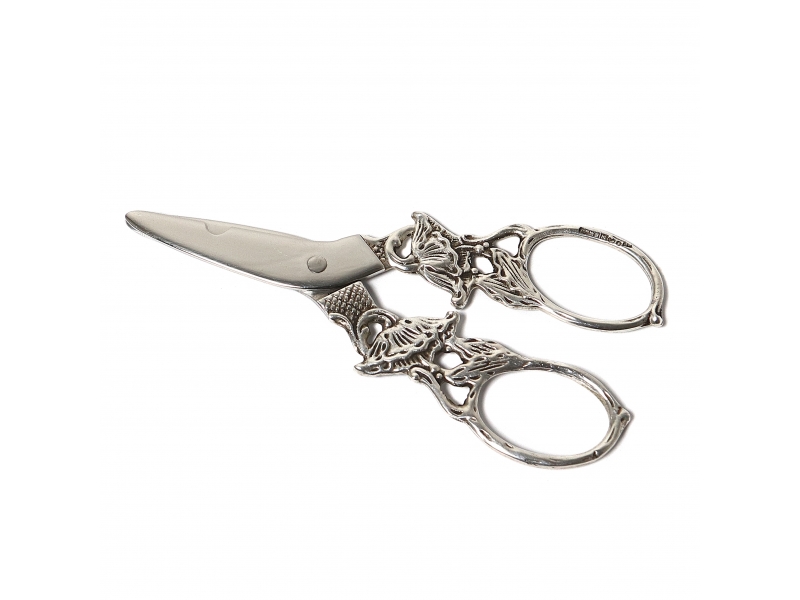 Длина: 10,5 см. Общий вес, включая стальное лезвие: 27 граммов, серебро 830 пробы. ============================== Scissors for grapes with silver handles and steel blades. Handles decorated with flowers.