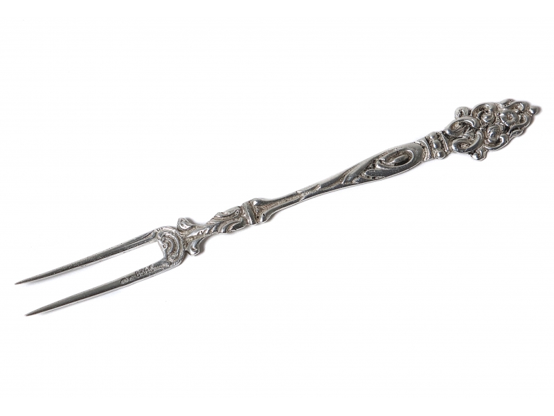Длина: 12 см. Вес: 8 граммов серебра 830 пробы. ========================= Silver serving (olive or lemon) fork.