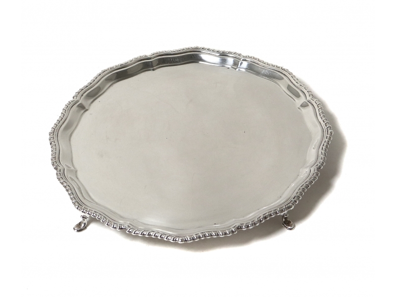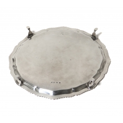 Высота: 3 см, максимальный диаметр: 26,2 см, диаметр рабочей поверхности: 22,5 см. Вес: 515 граммов серебра 925 пробы. =========================== Silver tray on the leg.