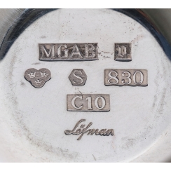 Высота: 5 см, диаметр верха: 5,5 см. Объём: 70 мл. Вес: 59 граммов серебра 830 пробы. =============================== Silver punch cup. Designer Eric Löfman.