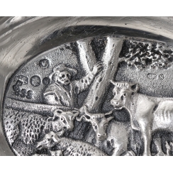 Серебряная пепельница, декорированная сюжетной миниатюрой.