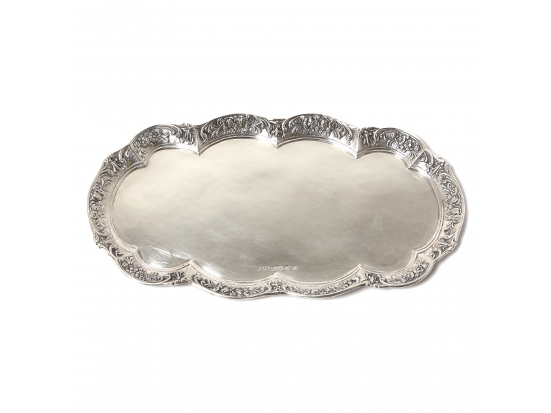 Небольшой серебряный поднос, декорированный цветочным орнаментом.