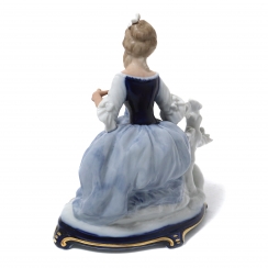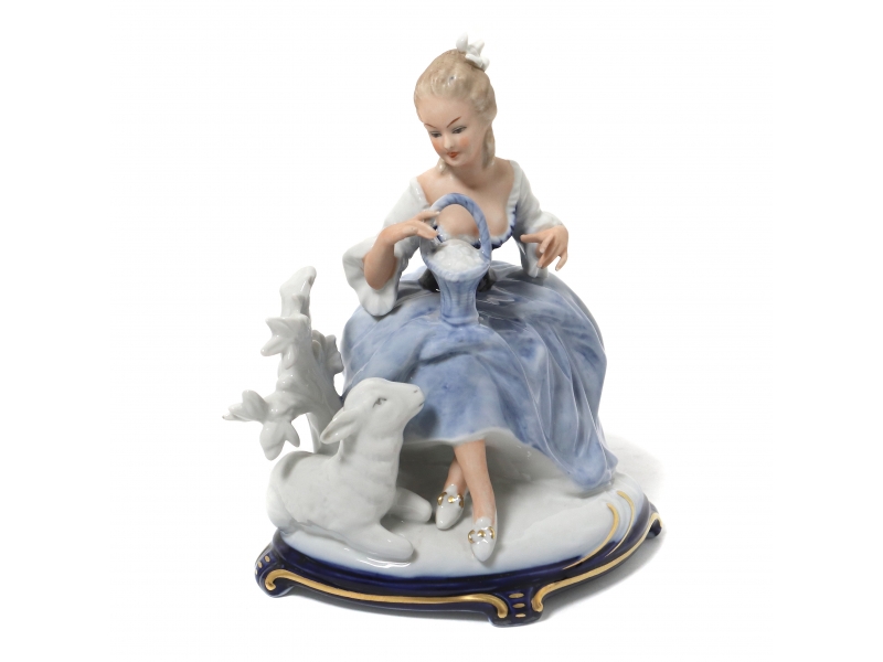 Фарфоровая фигура (статуэтка) "Девушка с корзиной цветов и ягнёнком". Редкая версия, расписанная кобальтом. Ручная роспись.