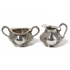Cеребряные сахарница и молочник, декорированные объёмным растительным узором.