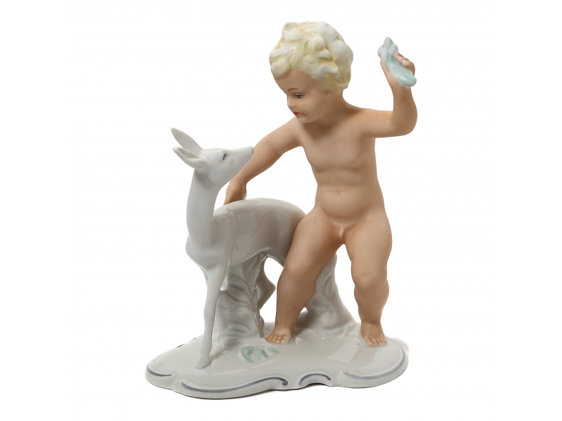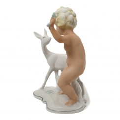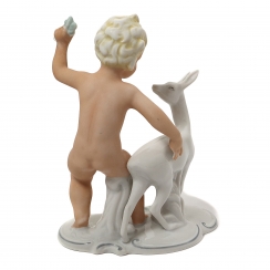Фарфоровая фигура (статуэтка) "Обнаженный мальчик (путти) с косулей". Ручная роспись.