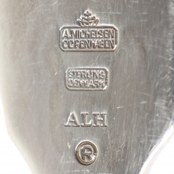 Mark of the designer. «A.MICHELSEN Sterling Danmark» - mark, confirming that the item is made in Danish workshop, of the supplier of the Danish royal court, and has the sterling silver. Each year since 1910 the eminent Danish manufacturer of silverware A. Michelsen produces the Christmas Spoon and dessert sets, consisting of spoons and forks. Danes, and not only they, traditionally include the cutlery of this series in Christmas gifts for the relatives. The most interesting Danish designers, painters and sculptors become the authors of design of these collection cutlery.