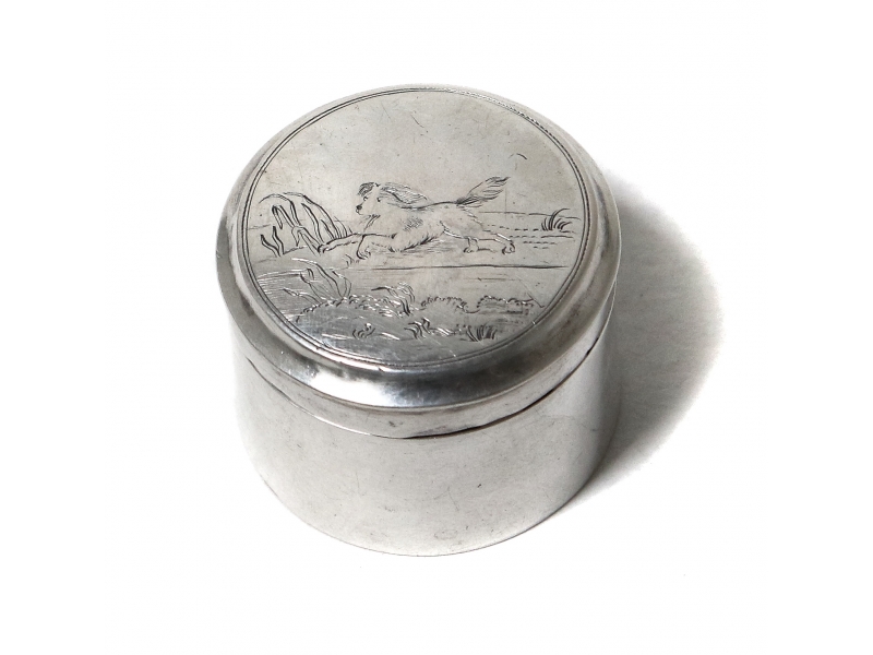 243737 - Серебряная таблетница. Швеция, 1850 год.Серебряная таблетница (коробка), декорированная изображением бегущей собаки.