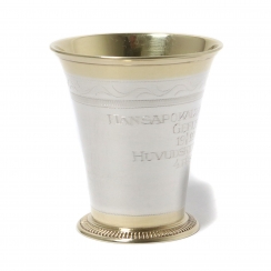Высота: 7 см, диаметр верха: 6,3 см. Объём: 85 мл. Вес: 48 граммов серебра 830 пробы.