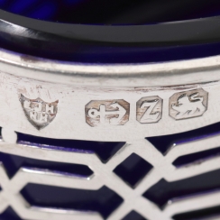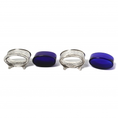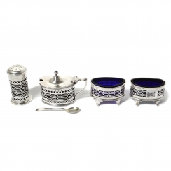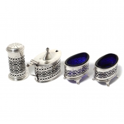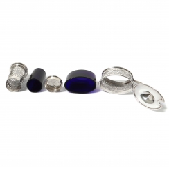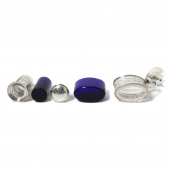 На крышке перечницы небольшая вмятинка, не влияющая на функционал. ========================== Silver spice set with cobalt inserts and a spoon, 4 pcs.